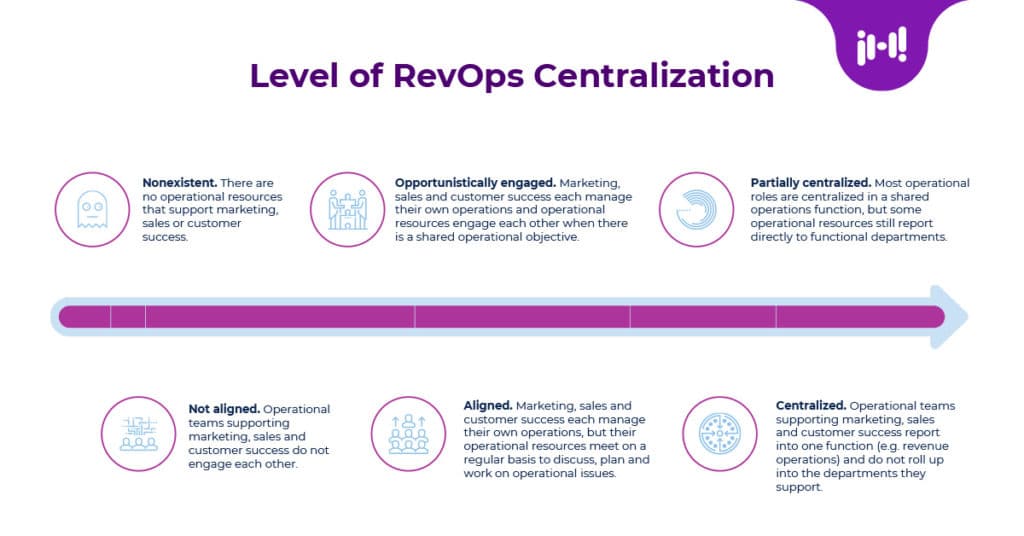 Rev Ops is a concept. It’s the operational alignment of sales, marketing, and customer success. And when that operational alignment is at its furthest point, RevOps becomes a centralized function. Once centralized, it subsumes marketing, sales, and customer support operations into one department. In speaking with and interviewing hundreds of B2B organizations on operational alignment, we have noted that the level of RevOps centralization in B2B tends to fall into six primary groups, ranging from nonexistent to fully centralized.