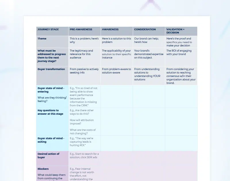 - The CTA for a given asset. Where a specific asset might prompt your audience to download another asset or visit a landing page, the desired action here should focus on your audience’s behavior after consuming the content at this journey stage—for example, begin searching for a solution, assemble a buying group, or validate your solution.