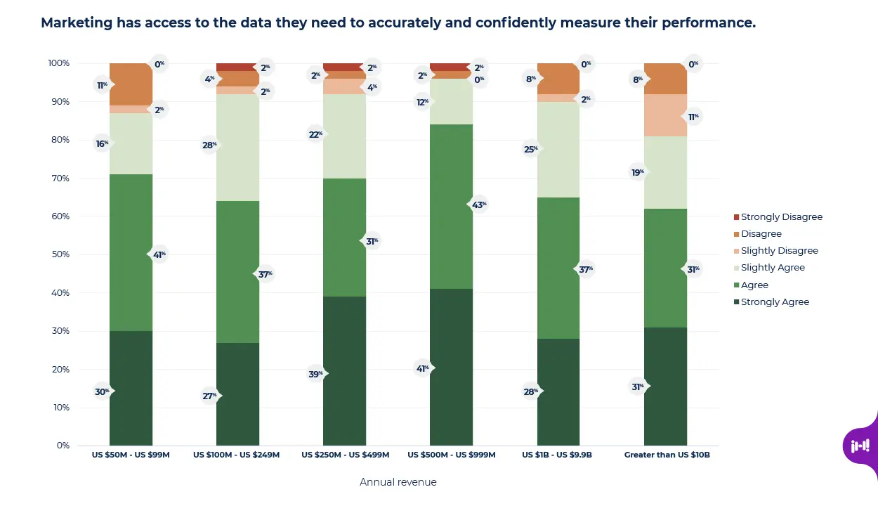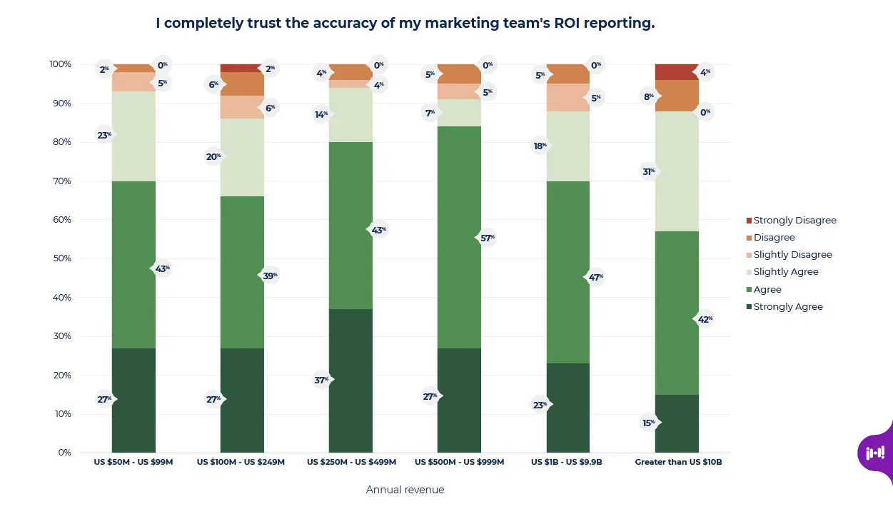 Only 57% of organizations with revenue greater than $10B and 70% of organizations in the $50-99M range indicated they completely trust their team’s ROI reporting. 82% of marketing teams in the midmarket range have this level of trust.