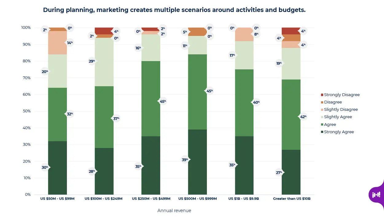 82% of marketing teams supporting midmarket organizations agree that they create multiple scenarios around activities and budgets. Marketing teams supporting larger or smaller organizations were less likely to agree.