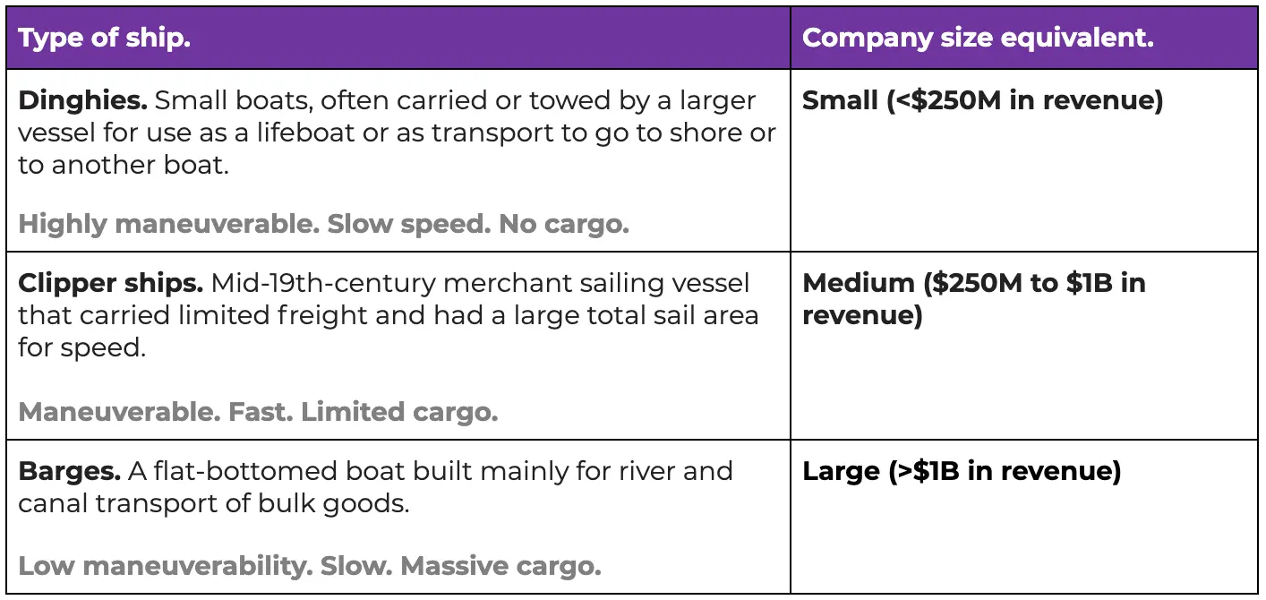 When I think of companies, I think of them as ships on the sea. I think of dinghies, clipper ships, and barges.